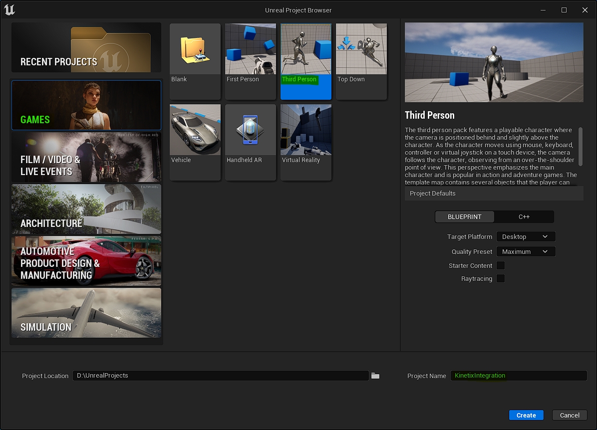 The Unreal Project Browser opens. Select the "Games" section, then select "Third Person", configure it to be Blueprint and name it (we will call it here "KinetixIntegration")